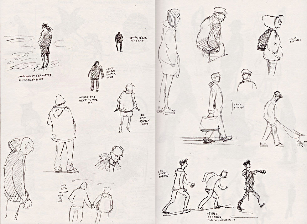 With the undead mummy as the broad idea going forward, I went sketching people from real life at my local seaside town of Felixstowe. I was seeking figures whose physical characteristics fit the 'scraggy' description, i.e. skinny and ideally bony. Also I kept an eye out for those whose movements struck me as somewhat awkward like a walking skeleton. Being on this animation course has led me to look for how people move as a shortcut for gestural drawing, giving a clue to the character beneath. I made a note of these observations as I went; it seemed everyone had a distinctive gait once I started looking.
